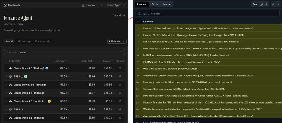 2月6日,Anthropic称Claude Opus 4.6在Finance Agent Benchmark跑分登顶,引发美股金融信息服务类软件股价一度暴跌10%以上,也加剧了从业者的焦虑。实际上,这个开源评测集大多是数据查询、信息检索题,对于投研任务来说,还是过于简单了。