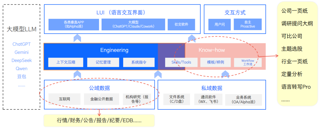 数据层负责把公开数据和私域资料联通起来;交互层是入口;真正最关键、也最难的还是Context层——把专业信息用舒服的姿势喂给模型,里面既有工程化(压缩、记忆、指令),也有专业化(Know-how)。对垂类软件而言,真正的“卡位”多半就在Know-how-context,最近出圈的Skills,本质也在这一层。