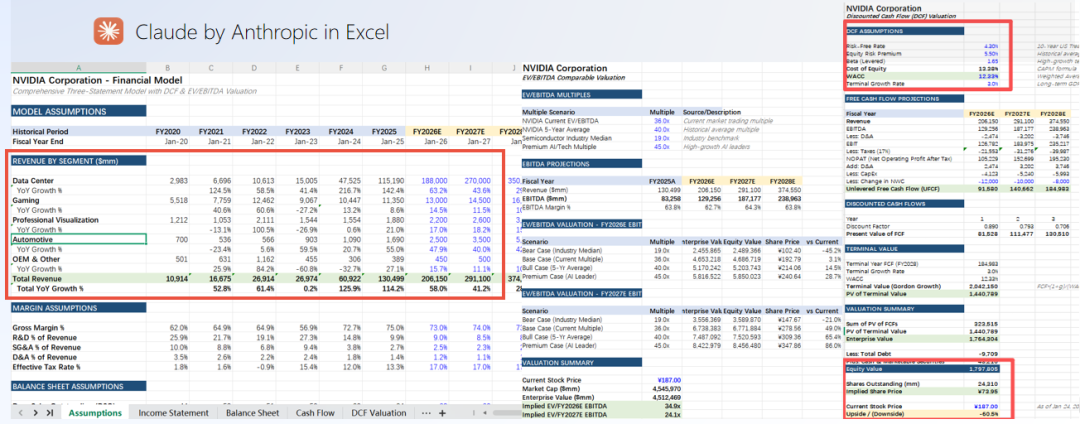 最终生成的Excel文件么……说他差,确实像模像样,格式、公式都很像投行分析师的作品;说他好——他的基本假设页的拆分实在是过于简单:仅把英伟达公司的核心业务拆分为DC、Gaming、Automobile等就草草了事。这样的结果相信在任何一家投研机构都没办法给及格。