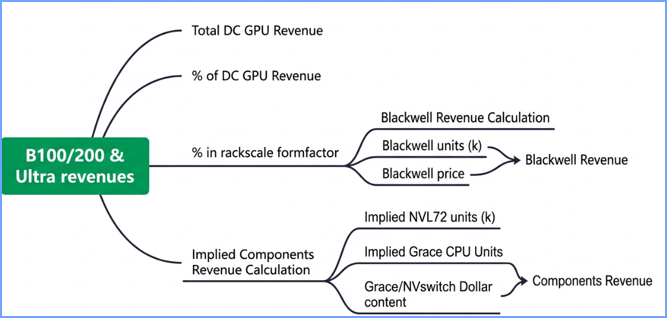 对于英伟达,哪怕是初级人类分析师,也会将公司的GPU(数据中心)业务进一步拆分为A、H、B、Rubin和其他衍生收入的细项,并针对B卡带来的隐含销售收入(如机柜、Grace CPU等)做出测算。